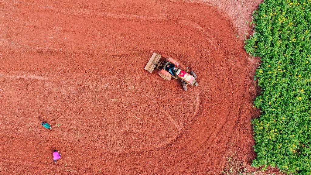 2022年2月25日,村民在四川省遂寧市安居區石洞鎮雙祠堂村勞作,為種植大豆做準備(無人機照片)。新華社發(劉昌松 攝)
