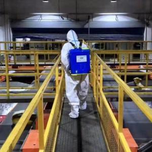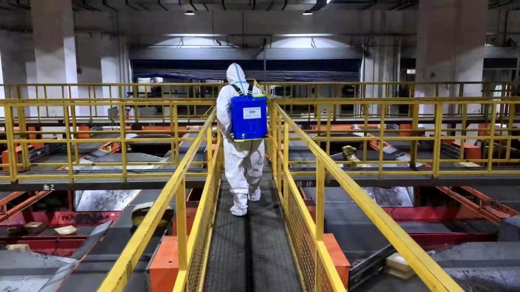 3月13日,圓通速遞杭州集運中心內,員工王杰正在對快件操作場地進行消殺。(圖片由采訪單位提供)