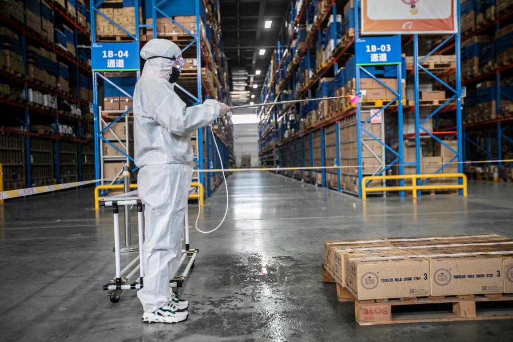 3月12日,菜鳥杭州下沙保稅倉內工作人員正在對商品外包裝進行六面消殺。(圖片由采訪單位提供)