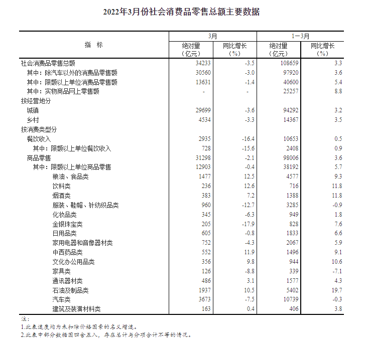 3月份,社會消費品零售總額34233億元,同比下降3.5%。其中,除汽車以外的消費品零售額30560億元,下降3.0%。