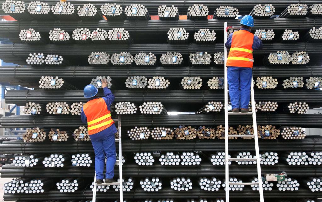 2022年4月19日,在位于承德市營(yíng)子區(qū)的承德建龍?zhí)厥怃撚邢薰緹o(wú)縫鋼管廠,工人檢查無(wú)縫鋼管品質(zhì)。新華社發(fā)(王立群 攝)