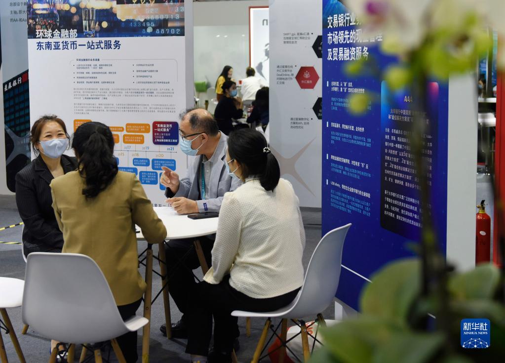 參會(huì)者在第四屆進(jìn)博會(huì)服務(wù)貿(mào)易展區(qū)大華銀行展臺(tái)交流(2021年11月7日攝)。新華社記者 徐亮 攝