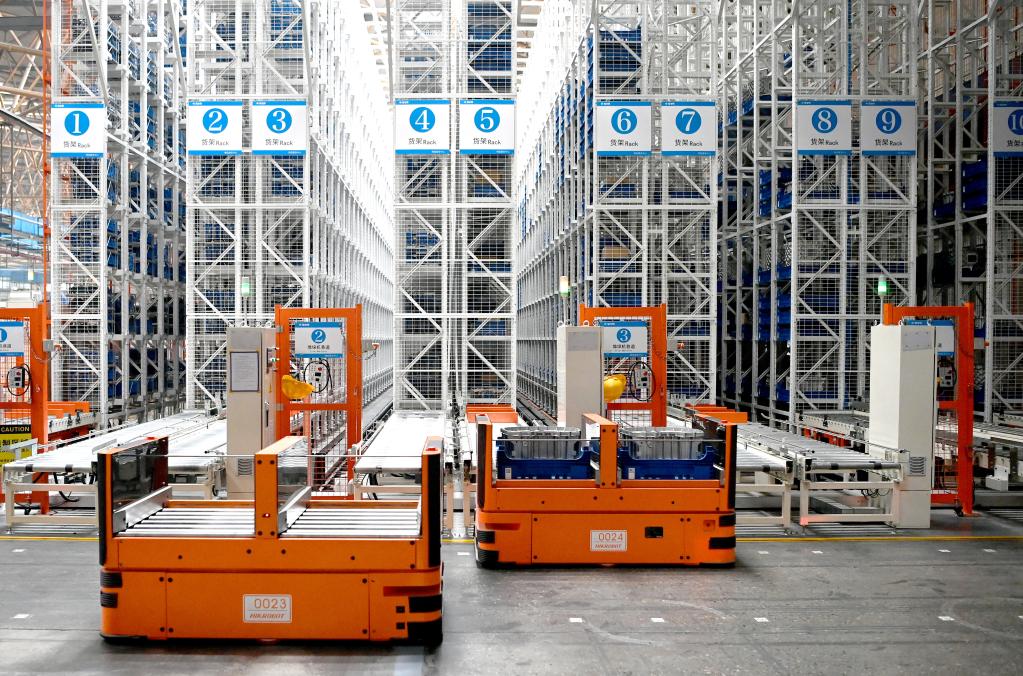 法士特集團(tuán)西安高新廠區(qū)智慧物流小車在進(jìn)行物品運(yùn)輸。新華社記者劉瀟 攝