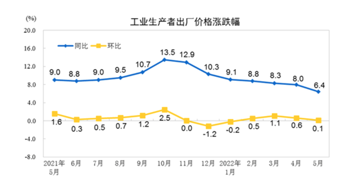 從全國工業(yè)生產(chǎn)者出廠價(jià)格指數(shù)(PPI)看,隨著各地區(qū)各部門高效統(tǒng)籌疫情防控和經(jīng)濟(jì)社會(huì)發(fā)展,保障重點(diǎn)產(chǎn)業(yè)鏈供應(yīng)鏈暢通穩(wěn)定,5月份PPI同比上漲6.4%,漲幅比上月回落1.6個(gè)百分點(diǎn)。