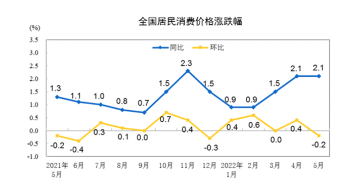 “5月份,國內(nèi)疫情防控形勢持續(xù)向好,消費(fèi)市場供應(yīng)總體充足,CPI環(huán)比由上月上漲0.4%轉(zhuǎn)為下降0.2%,同比漲幅保持穩(wěn)定。”國家統(tǒng)計(jì)局城市司高級(jí)統(tǒng)計(jì)師董莉娟說。