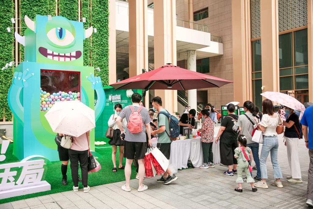 6月16日,位于浙江杭州的銀泰百貨門前,消費者在商場促銷活動中排隊體驗。(新華社記者 張璇 攝)
