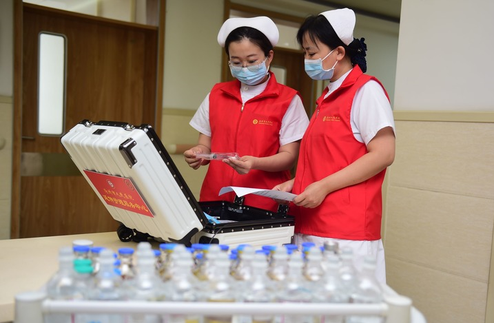 6月15日,滄州市人民醫院腫瘤院區的護士整理醫療用品,準備進行上門護理服務。 新華社發(傅新春 攝)