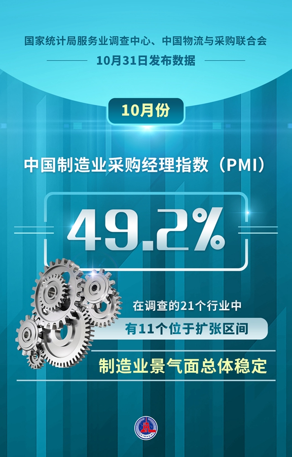 新華社北京10月31日電(記者魏玉坤)國家統計局服務業調查中心、中國物流與采購聯合會10月31日發布數據,10月份,中國制造業采購經理指數(PMI)為49.2%,在調查的21個行業中,有11個位于擴張區間,制造業景氣面總體穩定。