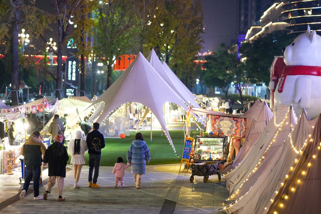 新華社重慶12月24日電(記者伍鯤鵬)煙熏火燎的夜宵攤位,琳瑯滿目的精美手辦……冬日的重慶市南濱路煙雨海棠公園彩虹集市恢復了久違的煙火氣,重新煥發出勃勃生機。市民們穿梭在一頂頂帳篷間購物消費與拍照打卡,再次感受著不夜重慶獨特的魅力。