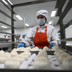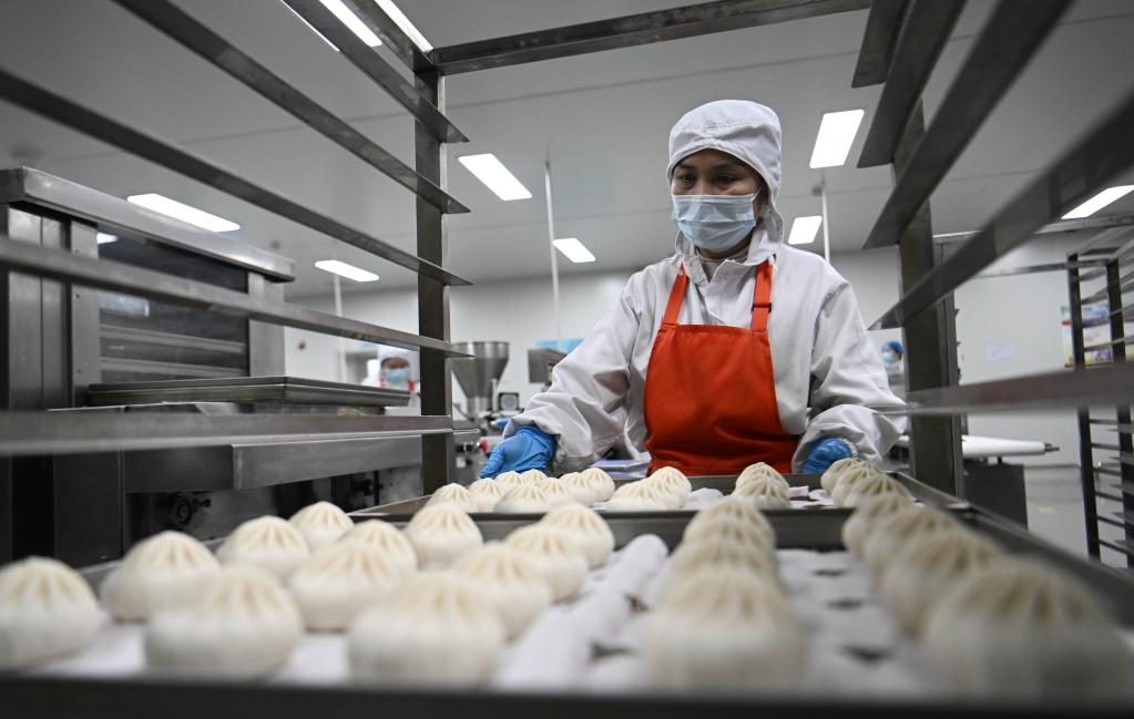 天津利達(dá)糧油有限公司速凍面食生產(chǎn)車間,工作人員在搬運(yùn)速凍包子(2月23日攝)。新華社記者 趙子碩 攝