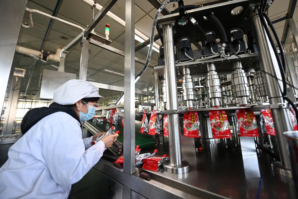在天津市利民調(diào)料有限公司辣醬灌裝生產(chǎn)線,工作人員在檢查產(chǎn)品包裝(2月20日攝)。新華社記者 趙子碩 攝