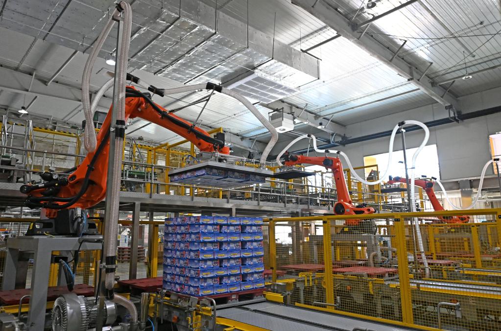 在天津海河乳品有限公司智能化生產(chǎn)線,智能生產(chǎn)設(shè)備在轉(zhuǎn)運(yùn)貨物(2月20日攝)。新華社記者 趙子碩 攝
