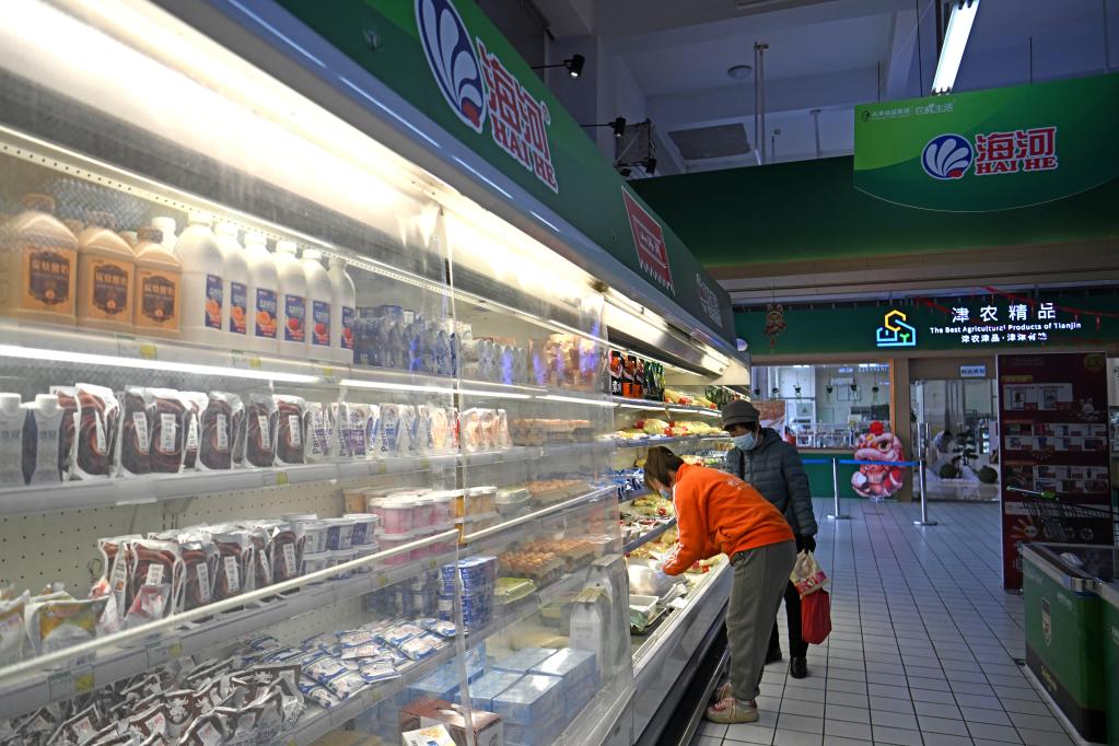 在天津食品集團(tuán)津農(nóng)精品體驗(yàn)店,顧客在選購乳制品(2月23日攝)。新華社記者 趙子碩 攝