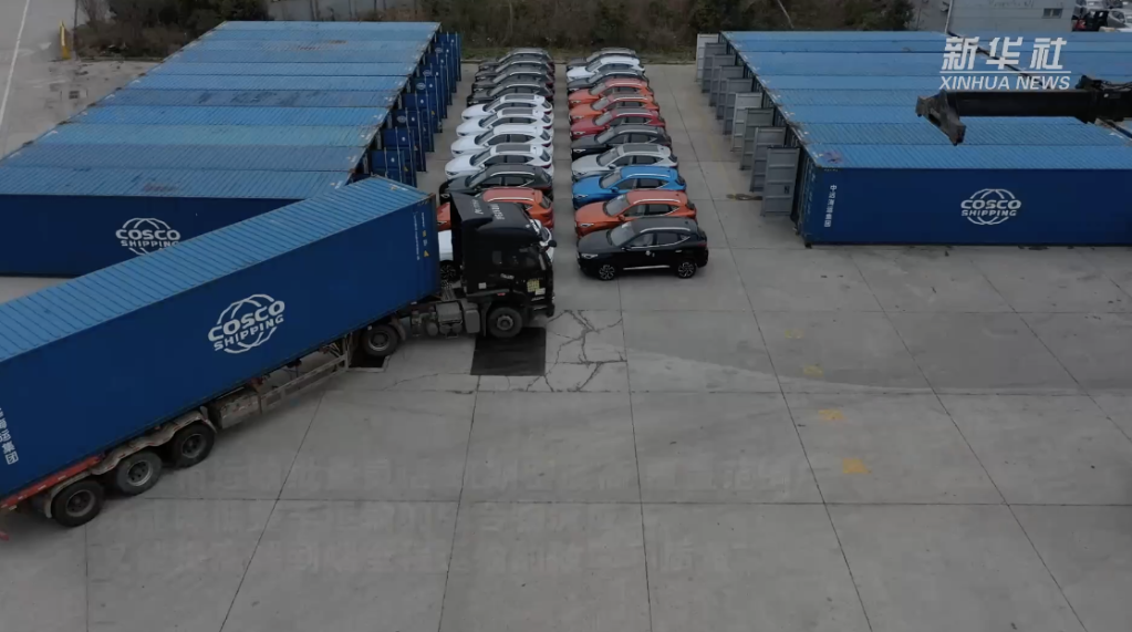 在上海集運(yùn)物流堆場(chǎng),1000臺(tái)汽車被裝進(jìn)集裝箱,搭乘超大型集裝箱船“中遠(yuǎn)海運(yùn)雙魚座”輪,從上海出運(yùn)至英國費(fèi)利克斯托港、比利時(shí)澤布呂赫港和德國威廉港。