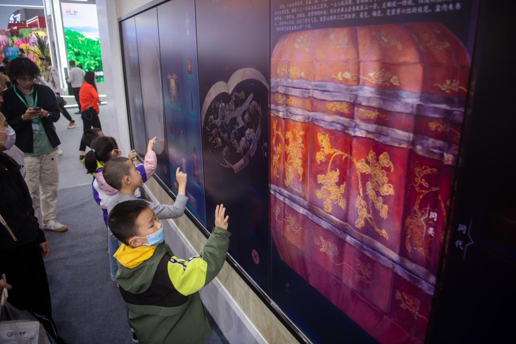甘肅館“我在敦煌畫壁畫”數字虛擬體驗活動現場圍滿了小朋友。5歲的張孟石在電子屏上選擇壁畫線稿,用朱紅、佛手黃、落英淡粉等巖彩進行填充。瞬間,一幅《雙鴿紋》壁畫便從遙遠的莫高窟“走”出來,躍上電子屏“活”了起來。“第一次嘗試‘畫’壁畫,覺得很好看、很好玩!更想去敦煌莫高窟旅游了。”張孟石神采飛揚地說。