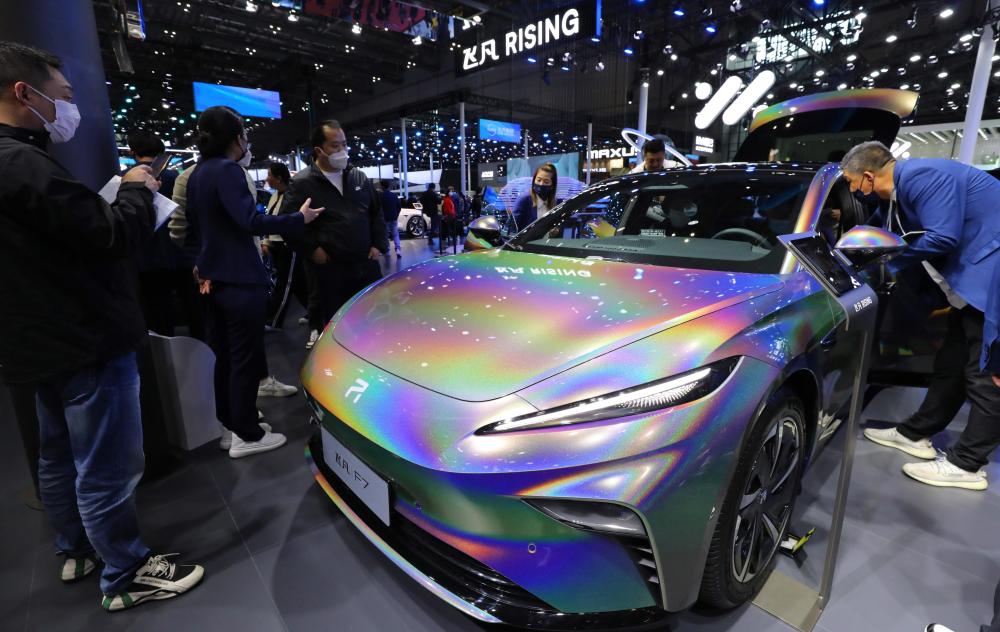 4月24日,參觀者在2023第二十屆上海國際汽車工業展覽會飛凡F7展車邊駐足觀看。新華社記者 方喆 攝
