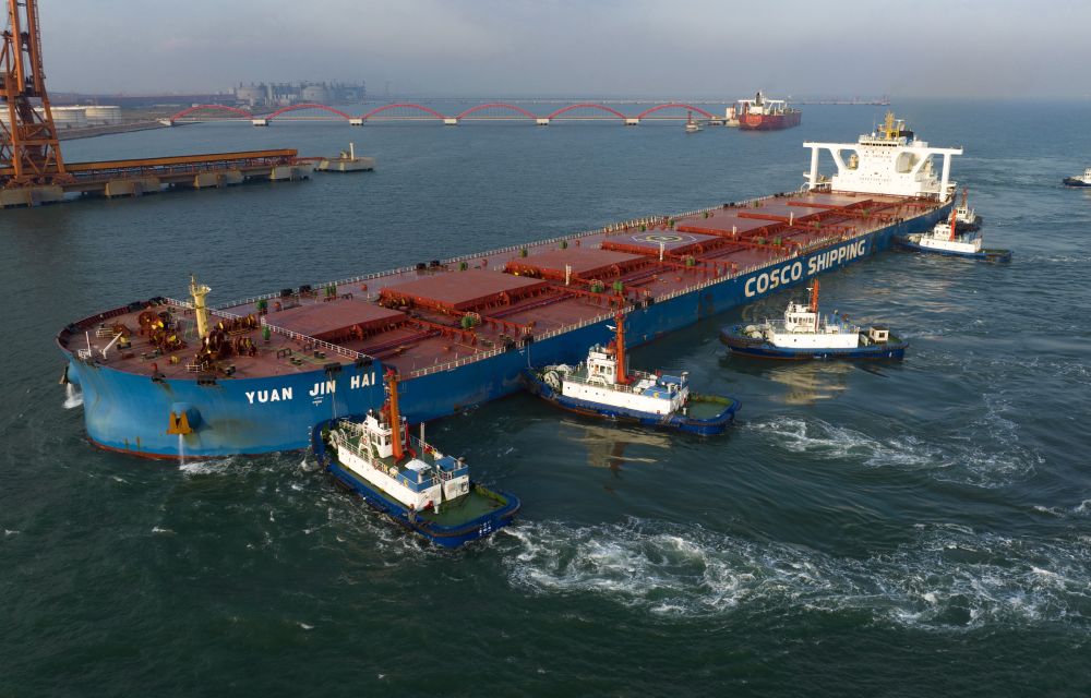一艘輪船在拖輪的協助下向河北港口集團唐山港曹妃甸港區礦石碼頭靠泊(2022年9月10日攝,無人機照片)。新華社記者 楊世堯 攝