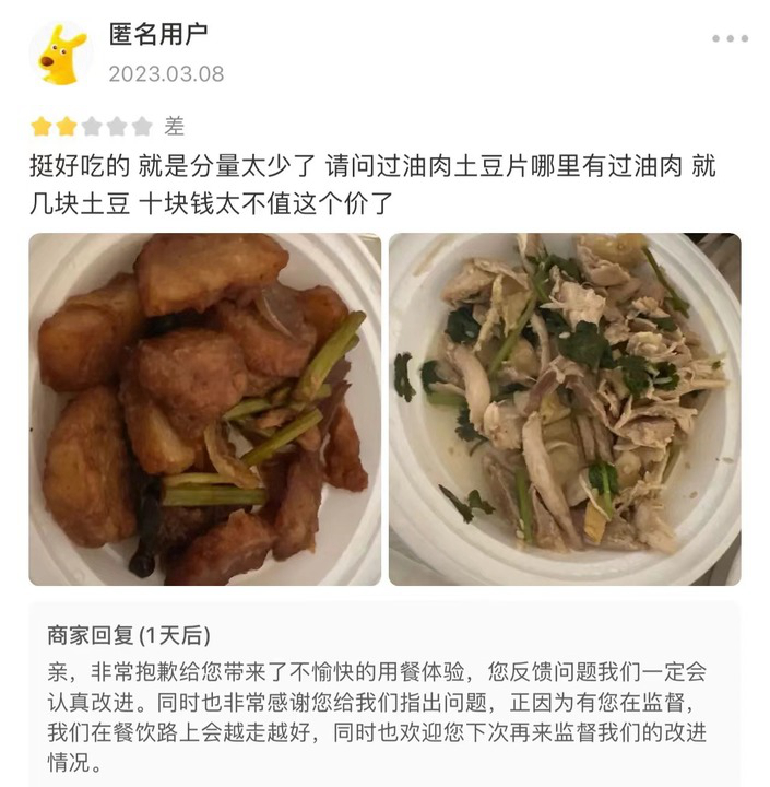 太原市萬象城、親賢街多家餐飲企業經營者表示,“同等條件下,消費者消費大份菜、一份菜價格要低于兩份小份菜、半份菜的價格之和,一些消費者認為不劃算,讓小份菜、半份菜推廣面臨困難。”在某外賣平臺,記者瀏覽發現,一些給予差評的消費者評價留言稱,小份菜的分量和價格不成正比、“量少價貴”等。