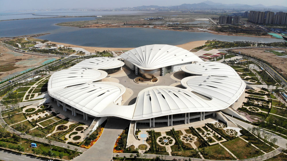 位于中國—上海合作組織地方經貿合作示范區的青島·上合之珠國際博覽中心(5月22日攝,無人機照片)。新華社記者 李紫恒 攝