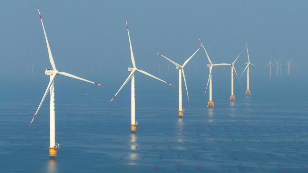 距離大連莊河市海岸線20多公里的黃海海域,300多座高約百米的“大風車”聳立在藍天碧海間,巨大的風電機組葉片不停轉動。莊河市發展和改革局副局長吳靜說:“目前,莊河已有4個海上風電項目并網運行,年發電量可達27.3億度。”