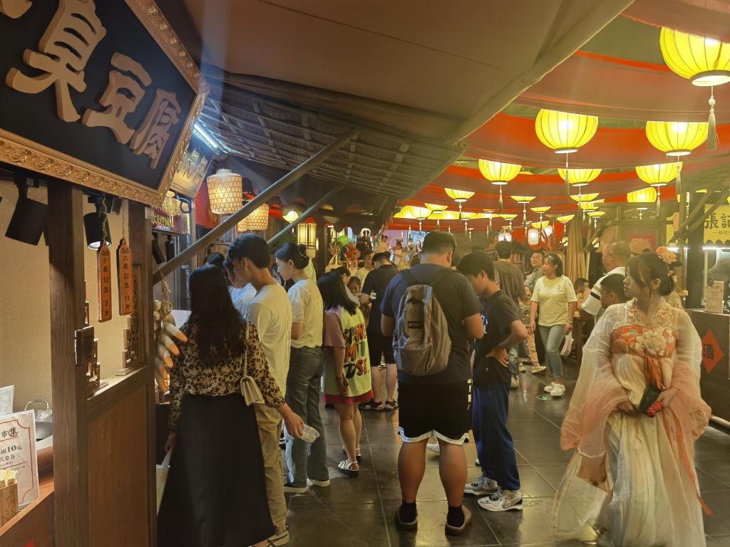 湖南長沙天心區五一商圈一家商場內的潭州市集里,燈籠、木拱橋、水車等把人們帶入古代繁華夜市。市集布置了影視級仿古街景,聚集47家不同類型的店鋪,涵蓋長沙本地小吃、角色扮演游戲、歌舞樂器表演等,可謂“食、游、娛、演、購”俱全。