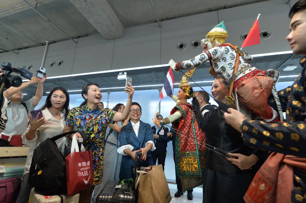 9月25日,工作人員在泰國曼谷素萬那普國際機(jī)場(chǎng)迎接中國游客。新華社發(fā)(拉亨 攝)