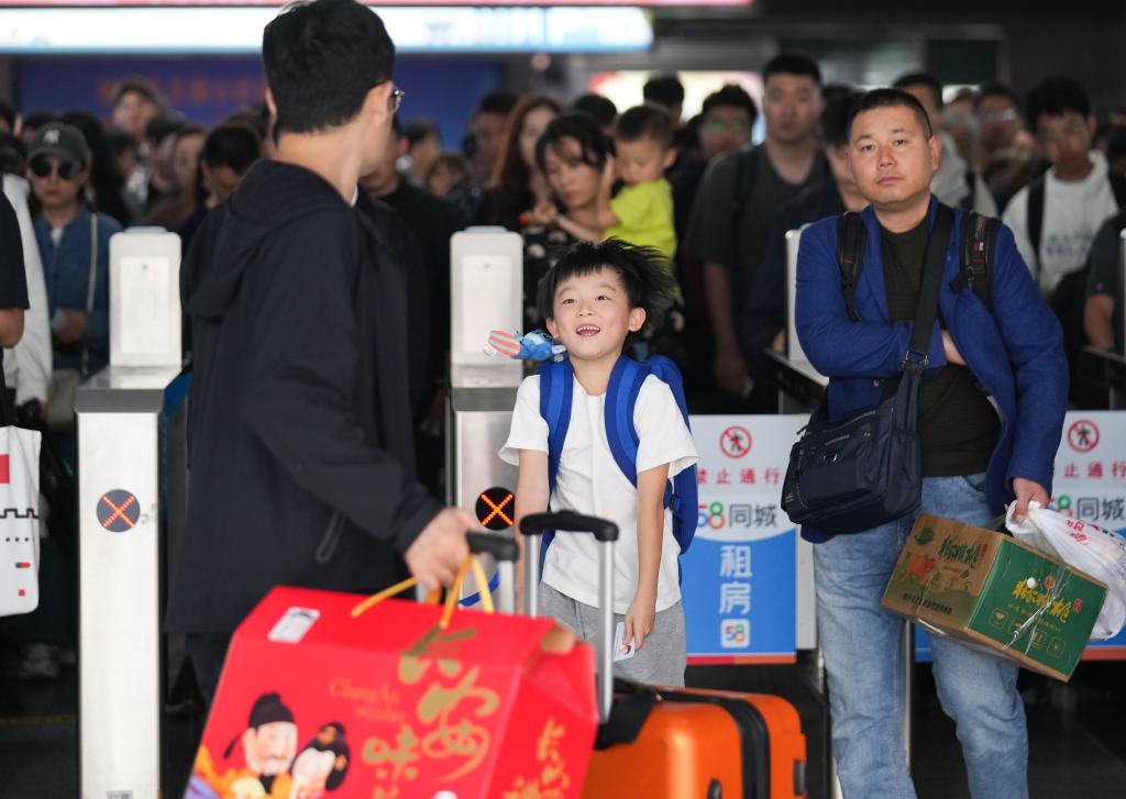 10月6日,剛抵達上海火車站的旅客在準備出站。當日是中秋、國慶長假的最后一天,全國各地迎來返程高峰。新華社記者 丁汀 攝