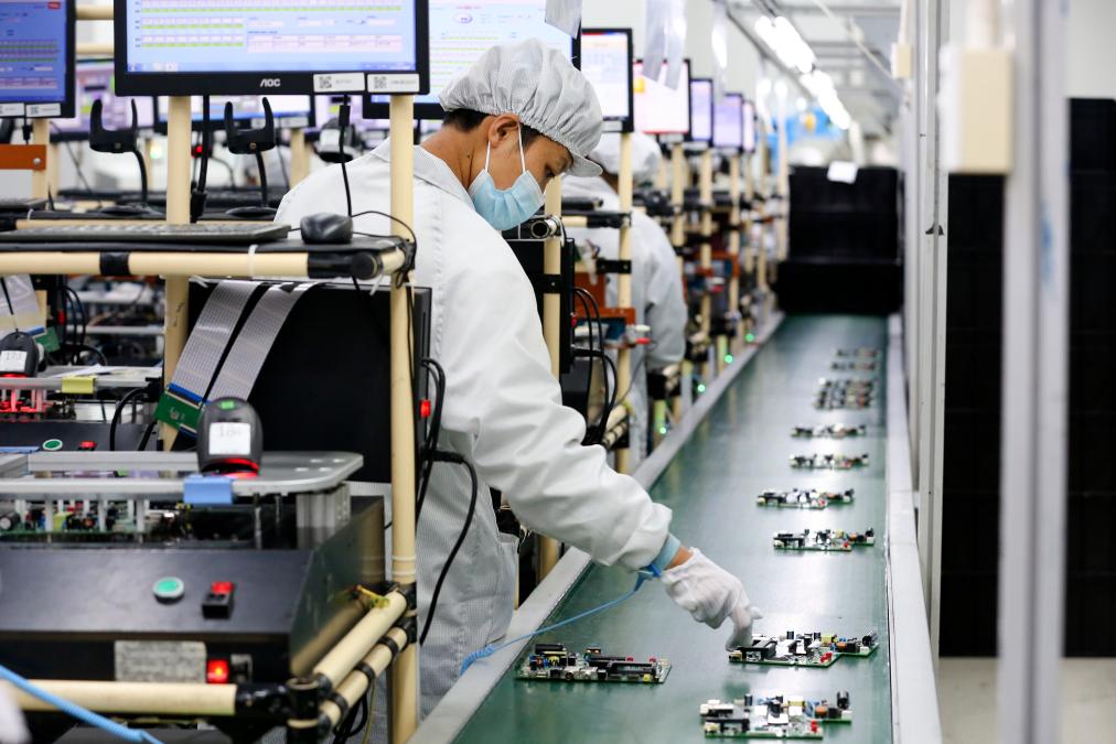 成都國際鐵路港綜合保稅區,工人在TCL出口加工制造基地生產車間生產電視機芯片。(白桂斌 攝)