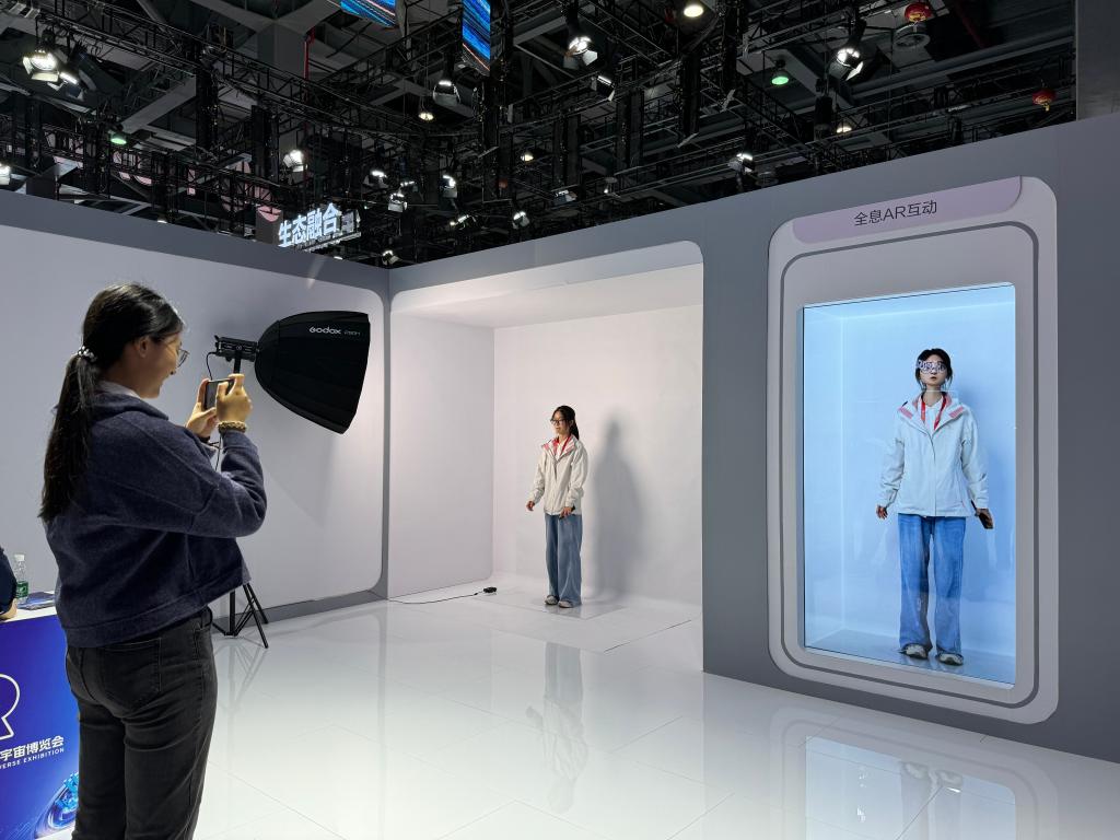 這是參展觀眾在體驗(yàn)全息AR互動(dòng)。新華社記者陳柱佐 攝