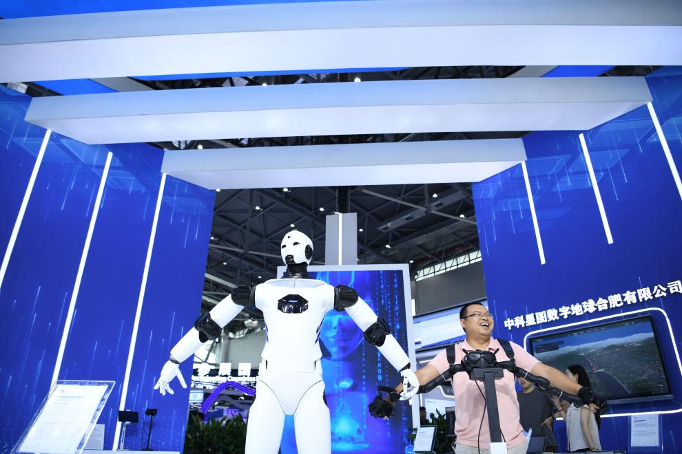 9月20日,在2023世界制造業(yè)大會上,觀眾在體驗一款VR遠程抓取機器人。新華社記者張端 攝