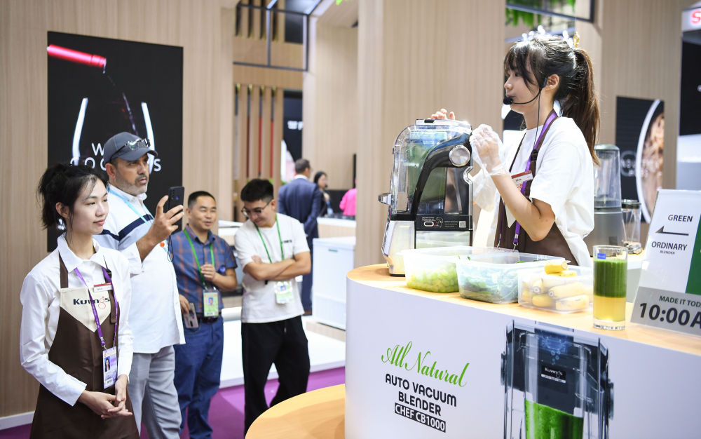 在第134屆廣交會上,進口展區的韓國企業展臺介紹小家電產品(2023年10月15日攝)。新華社記者 鄧華 攝