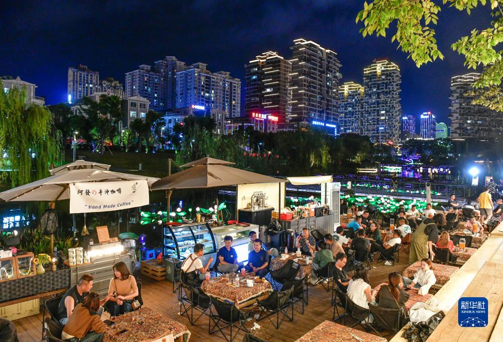 2023年9月14日,游客和市民在貴州省黔西南布依族苗族自治州興義市馬嶺河夜間消費聚集區休閑。新華社記者 楊文斌 攝
