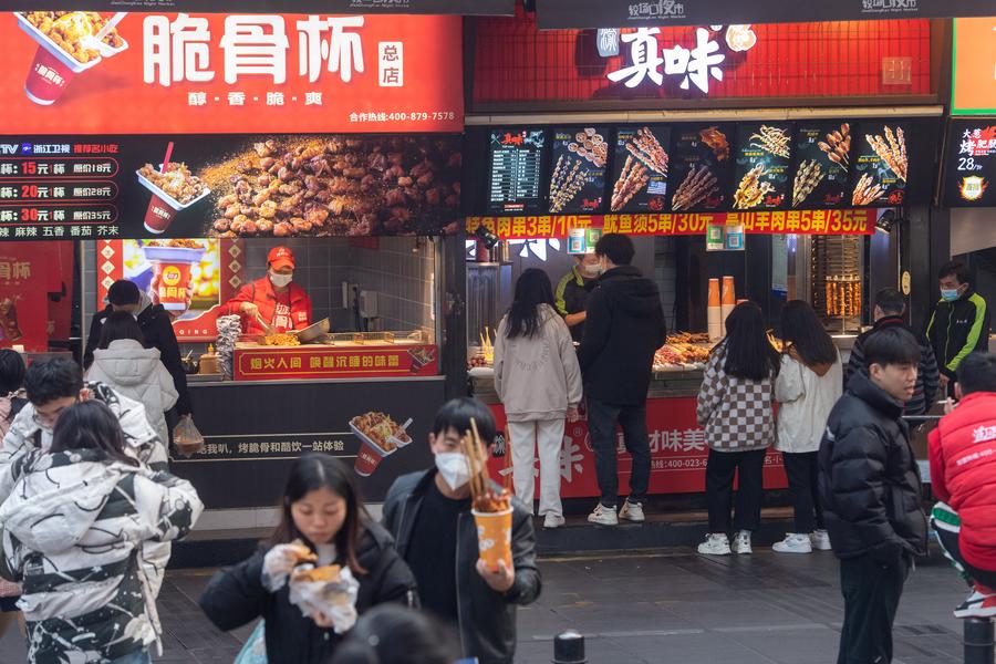 2023年12月23日,在位于重庆解放碑商圈的八一路好吃街上,市民游客挑选小吃美食。新华社记者 唐奕 摄