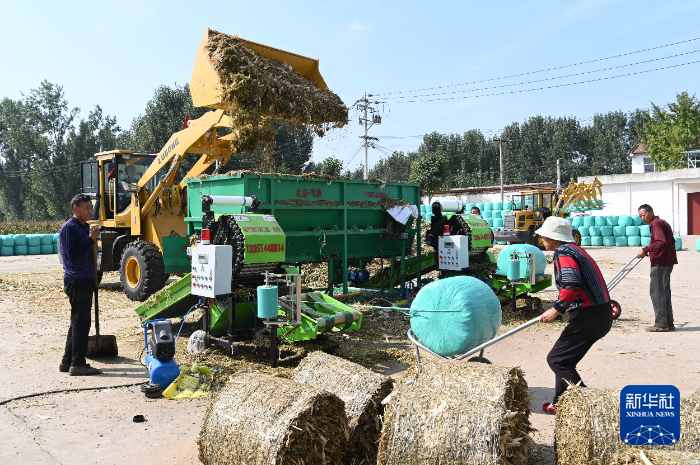 在河南省沁阳市柏香镇南王村,一家种植专业合作社社员打包加工青贮饲料。新华社发(杨帆 摄)