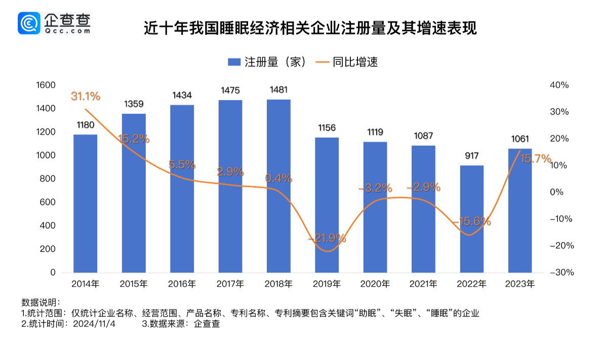 据企查查数据显示,我国现存1.96万家睡眠经济相关企业。2023年全年新增注册相关企业达1061家,同比增长15.7%,为近五年注册量增速最大的一年。