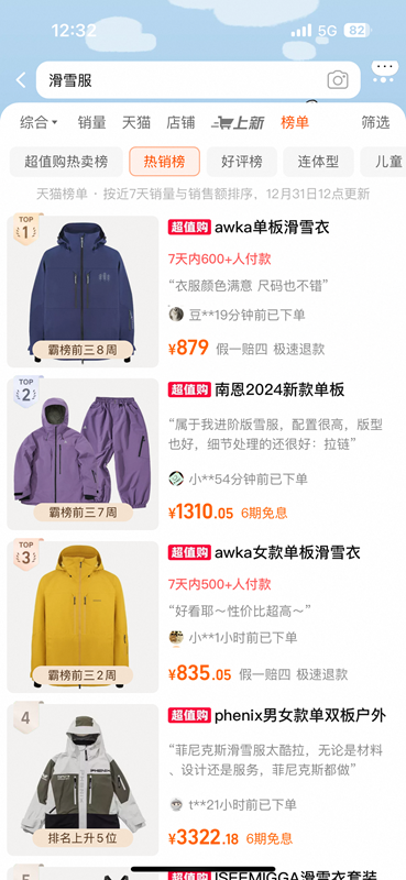 天猫“双旦”礼遇季期间,国产品牌ISEE MIGGA成交同比增长超500%,awka 3L滑雪服单日卖2000多件。在天猫滑雪服销量榜(截至2024年12月31日)前10名中,7个均为国产品牌。