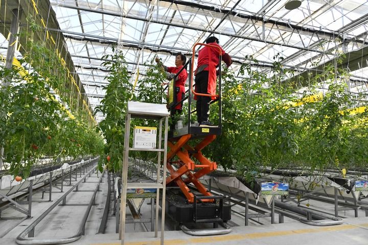 2024年3月19日,蔬菜种植户在山东省潍坊市寒亭区的智能温室大棚里进行管护作业。新华社记者 徐速绘 摄
