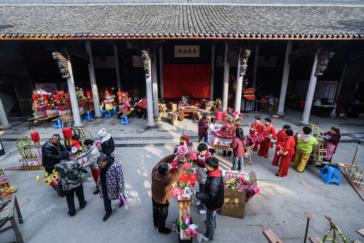 2025年1月22日,在浙江省诸暨市安华镇丰江周村,文化特派员带领青年志愿者和村民共同赶制板凳龙。新华社记者 徐昱 摄