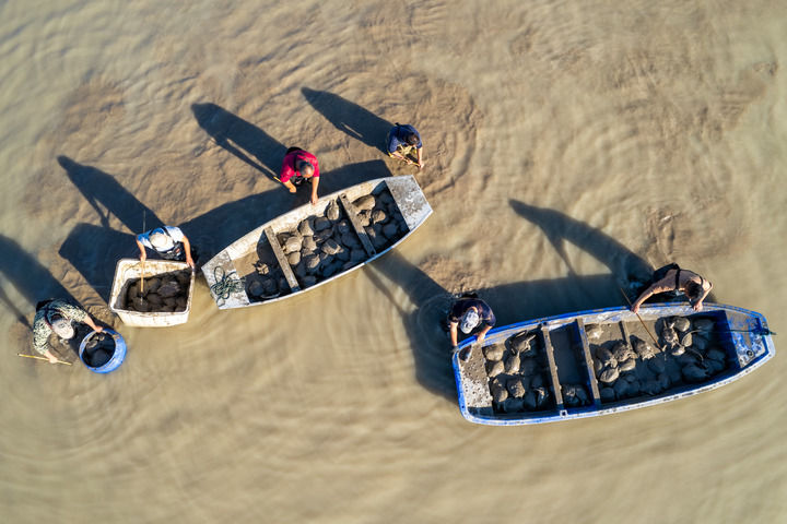 2024年11月29日,工人在位于湖南省汉寿县的湖南华甲农业集团有限公司生态甲鱼产业园捕捞甲鱼(无人机照片)。新华社记者 陈思汗 摄