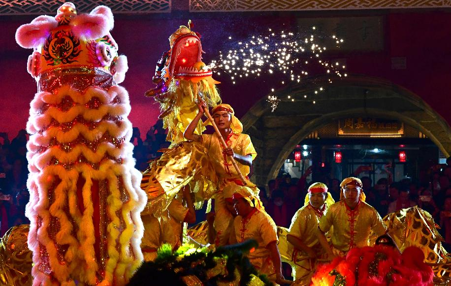 2025年福建省莆田“尾暝灯”文艺踩街活动举行。这是活动开场的舞龙舞狮表演。(2025年2月26日摄)新华社记者 魏培全 摄
