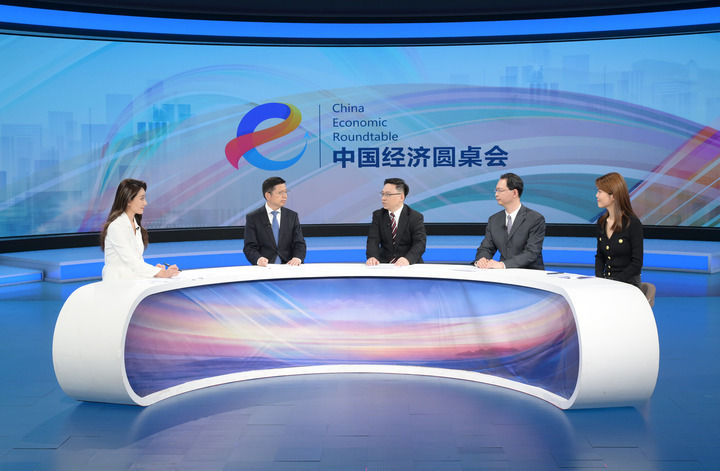 嘉宾们在第十七期“中国经济圆桌会”大型全媒体访谈节目录制现场交流发言。新华社记者 李贺 摄