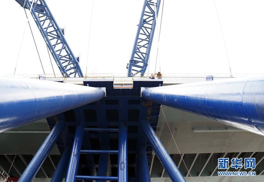 “冒出來”的并不是一座完整的大橋,而是一段跨徑長達200米的雙拱鋼橋,在海面中央兀然矗立。“這是我們大橋工程最核心的主橋部分,技術難度最大,對整個項目有里程碑的意義。”承建單位中國路橋工程有限公司董事、項目總指揮闞軍說。