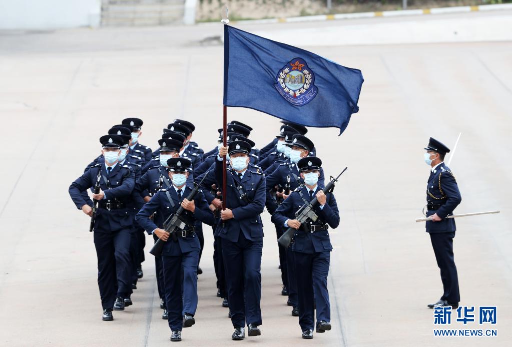 上午10時許,在香港警察學院,隨著警察樂隊奏響《歌唱祖國》,國旗方隊踢正步入場?!跋蛴铱待R”“向前看”“向國旗敬禮”,在雄渾有力的口令指揮下,國旗方隊迅速完成轉體轉身、立定靠腳等一系列動作。