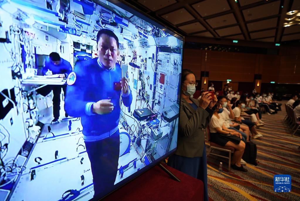 9月3日,正在天宮空間站執行任務的神舟十二號乘組與香港科技工作者、教師和大中學生進行天地連線互動。新華社記者 呂小煒 攝