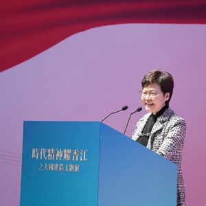 全體起立奏唱國歌后,林鄭月娥發表致辭表示,“時代精神耀香江”系列活動在香港廣受市民歡迎,有幸參與的人士皆驚嘆我國科技發展一日千里,也對身為中國人有了更強的歸屬感和自豪感。她指出,香港迎來了新局面、新起點,未來更好地融入國家發展大局特別是建設粵港澳大灣區,需要香港同胞對祖國有更強的向心力。她強調,祖國始終是香港堅強的后盾,未來數年特區政府的基本工程開支預計每年將超過1000億港元,以改善市民居住環境,提升市民生活指數,建設宜居宜業宜游的香港。
