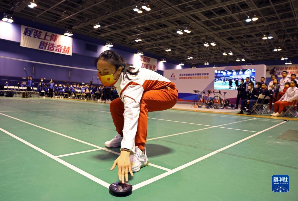 12月5日,內地奧運健兒訪港代表團成員朱雪瑩(前)在香港體院參加互動游戲。新華社記者 賈浩成 攝