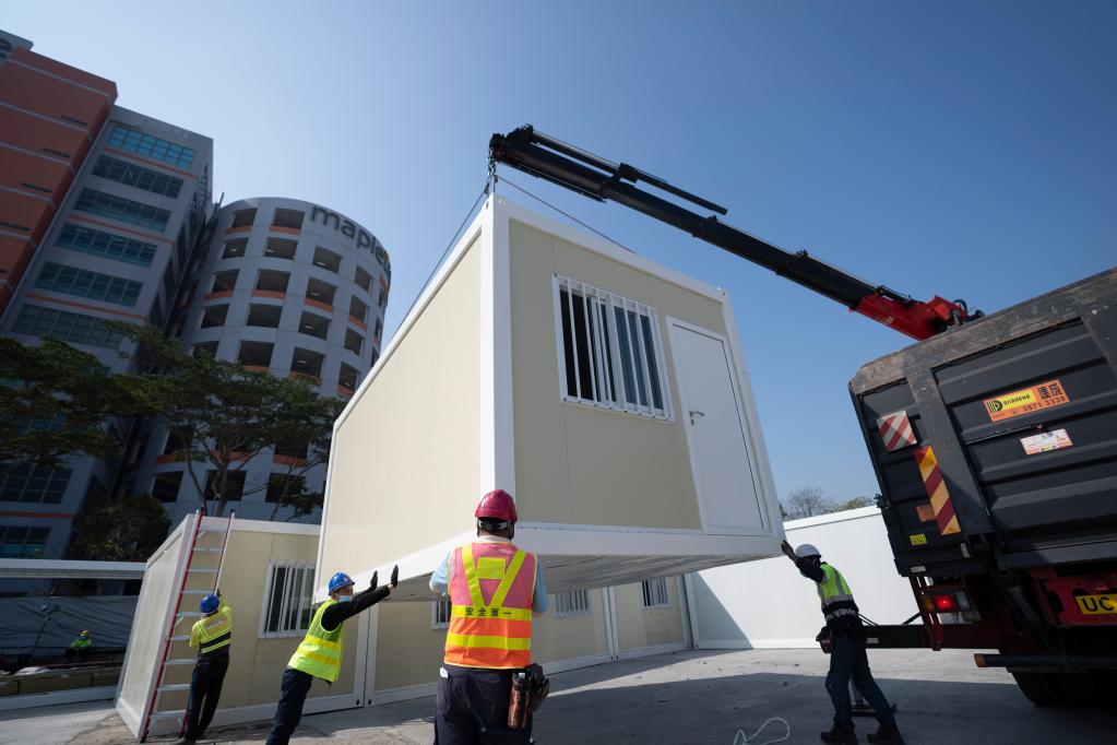 2月26日,工作人員在青衣方艙醫院施工。新華社記者 呂小煒 攝