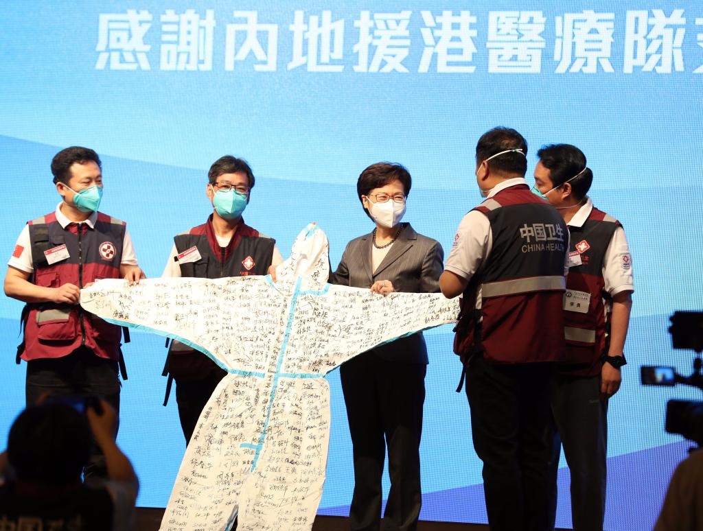 5月5日,內地援港醫療隊向香港特區行政長官林鄭月娥(左三)贈送簽名防護衣。新華社記者 李鋼 攝