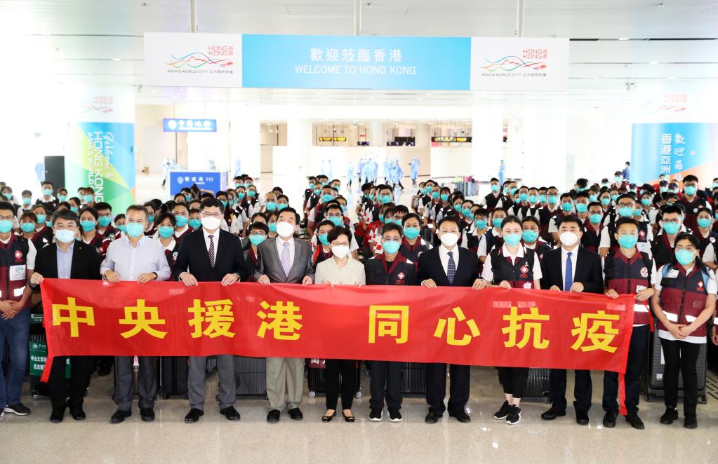 3月16日,香港特區行政長官林鄭月娥、香港中聯辦副主任尹宗華等到口岸迎接內地援港醫療隊。新華社記者 李鋼 攝
