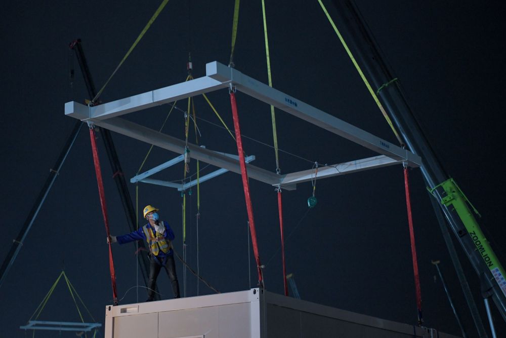 3月20日夜晚,一名工人在中央援港應急醫院建設現場進行吊裝作業。